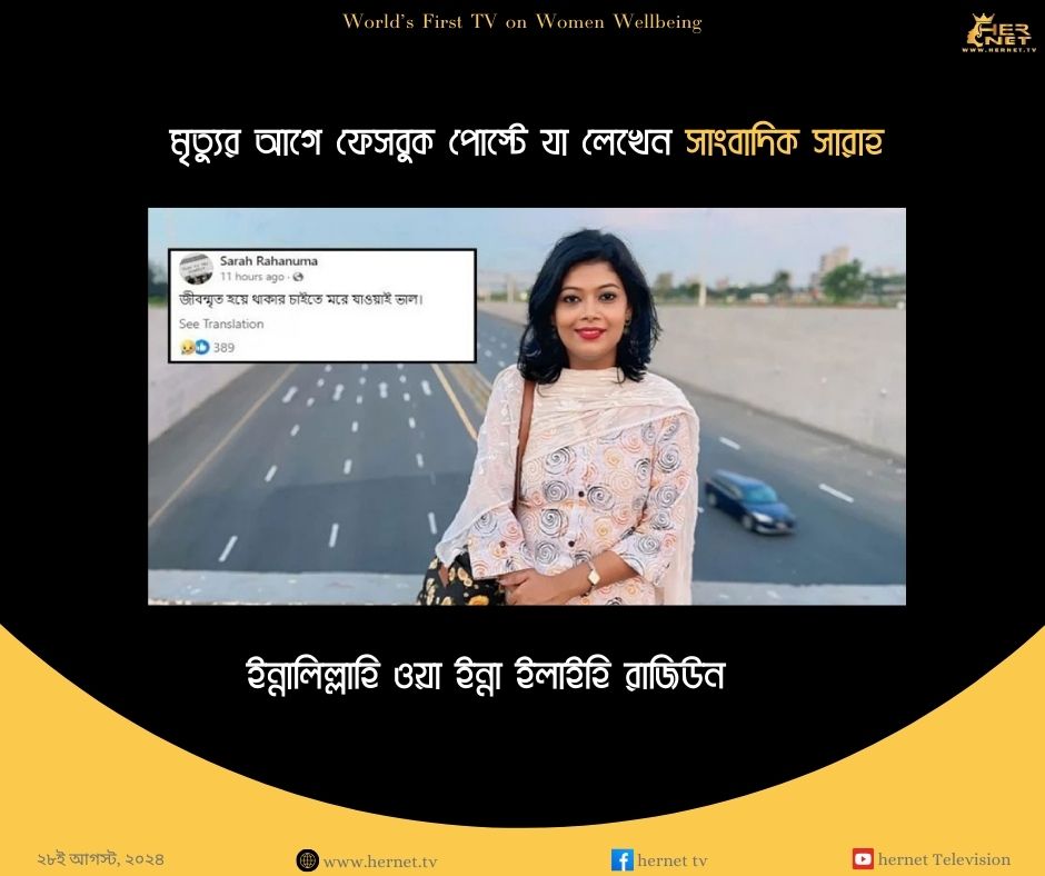 গতকাল মঙ্গলবার রাত ১১টার দিকে তিনি ফেসবুকে লেখেন, ‘তোমার মত বন্ধু পেয়ে আমি ভগ্যবান। আল্লাহ তোমাকে সর্বদা মঙ্গল করুন। আশা করি, শীঘ্রই তোমার সব স্বপ্ন পূরণ হবে। আমি জানি আমরা একসঙ্গে অনেক পরিকল্পনা করেছি। দুঃখিত, আমাদের পরিকল্পনা পূরণ করতে পারছি না। আল্লাহ তোমার জীবনের প্রতিটি ক্ষেত্রে আশীর্বাদ করুন।’ সারাহর স্বামী সায়েদ শুভ্র এ প্রসঙ্গে বলেন, ‘সম্পর্কের মাধ্যমে সাত বছর পূর্বে আমরা পরিবারকে না জানিয়ে বিবাহ করেছিলাম। গতকাল সারাহ অফিসে গিয়ে রাতে আর বাসায় না ফিরে এক ব্যক্তিকে দিয়ে রাত সাড়ে ১০টার দিকে বাসা ভাড়ার টাকা পাঠিয়ে দিয়েছিল।’ রাজধানীর হাতিরঝিলে বেসরকারি টেলিভিশন চ্যানেল জি-টিভির সাংবাদিক রাহানুমা সারাহর (৩২) লাশ উদ্ধার করা হয়েছে। গতকাল মঙ্গলবার দিবাগত রাত সাড়ে ১২টার দিকে তার লাশ উদ্ধার করা হয়।